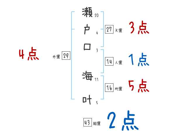 天運![]()  | 瀬戸口海叶さんの天運は27画の3つ星!頭脳明晰だが強情で摩擦が多い傾向。孤立に注意。 家系が持つ宿命的な運勢を表します。祖先から受け継いだ苗字ですので自分の力が及びません。家柄を象徴します。 |