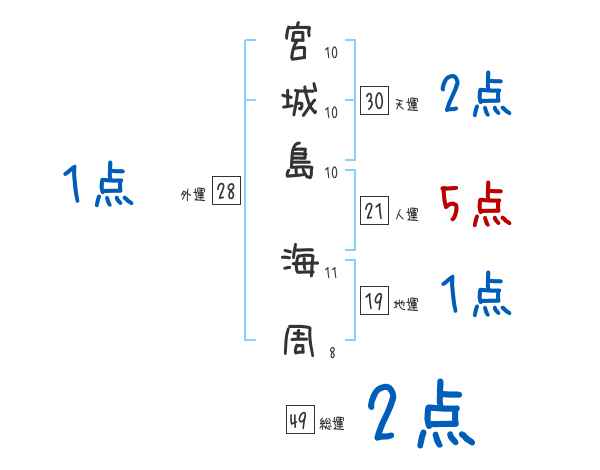 人運![]() | 宮城島海周さんの人運は21画の5つ星!統率力がある。独立し成功する。名誉を手に入れる。 性格や才能などを表す2番目に重要な運勢です。人間関係や協調性、社会的な成功に影響します。主に20歳から50歳ぐらいまでの中年期の運勢を表します。 |