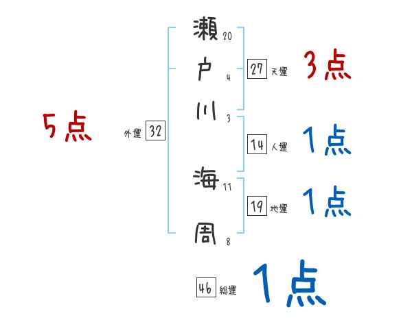 外運![]() | 瀬戸川海周さんの外運は32画の5つ星!柔軟性があり成功する。チャンスが多く金運が良い。 生活面を象徴する運勢です。外部から受ける影響力を表し、結婚運、家庭運や職場、環境への順応性を表します。 |