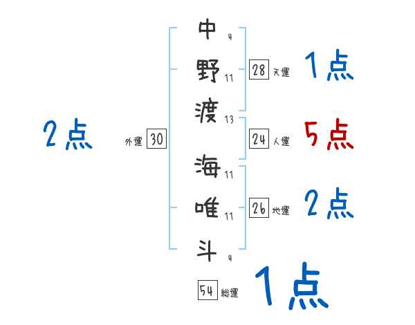 外運![]() | 中野渡海唯斗さんの外運は30画の2つ星!浮き沈みの激しさに注意しましょう。 生活面を象徴する運勢です。外部から受ける影響力を表し、結婚運、家庭運や職場、環境への順応性を表します。 |
