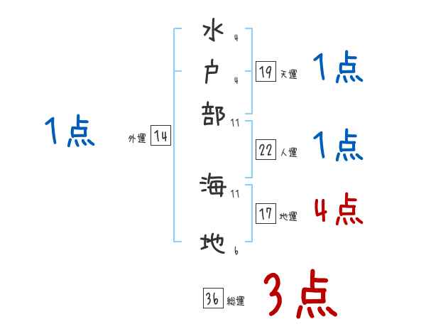 外運![]() | 水戸部海地さんの外運は14画の1つ星!人に対して優しいがストレスを溜め込みがち。人間関係のトラブルを避けるよう気をつけましょう。 生活面を象徴する運勢です。外部から受ける影響力を表し、結婚運、家庭運や職場、環境への順応性を表します。 |