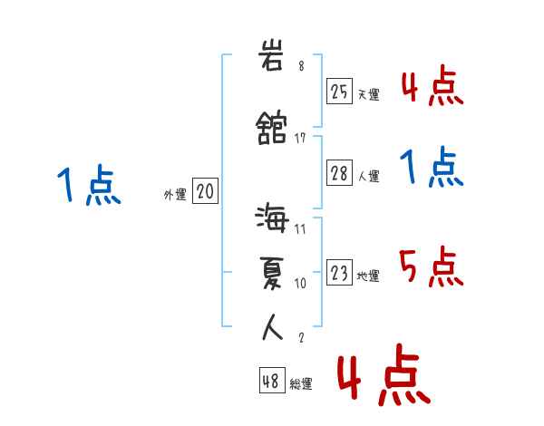 人運![]() | 岩舘海夏人さんの人運は28画の1つ星!家庭環境に注意。スポーツで活躍できる能力があるかも。 性格や才能などを表す2番目に重要な運勢です。人間関係や協調性、社会的な成功に影響します。主に20歳から50歳ぐらいまでの中年期の運勢を表します。 |