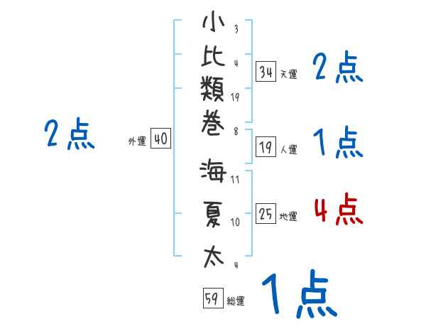外運![]() | 小比類巻海夏太さんの外運は40画の2つ星!自信過剰で物事に固執するためトラブルに注意。 生活面を象徴する運勢です。外部から受ける影響力を表し、結婚運、家庭運や職場、環境への順応性を表します。 |