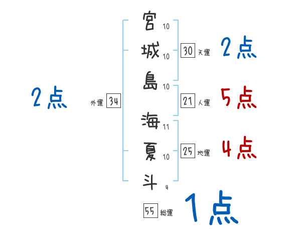 天運![]() | 宮城島海夏斗さんの天運は30画の2つ星!浮き沈みの激しさに注意しましょう。 家系が持つ宿命的な運勢を表します。祖先から受け継いだ苗字ですので自分の力が及びません。家柄を象徴します。 |