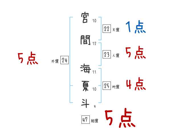 外運![]() | 宮間海夏斗さんの外運は24画の5つ星!家庭運が良く順調な人生。金運にも恵まれる。 生活面を象徴する運勢です。外部から受ける影響力を表し、結婚運、家庭運や職場、環境への順応性を表します。 |