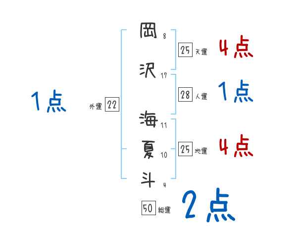 天運![]() | 岡沢海夏斗さんの天運は25画の4つ星!個性があり才能があふれる。強運の持ち主で発展する。 家系が持つ宿命的な運勢を表します。祖先から受け継いだ苗字ですので自分の力が及びません。家柄を象徴します。 |