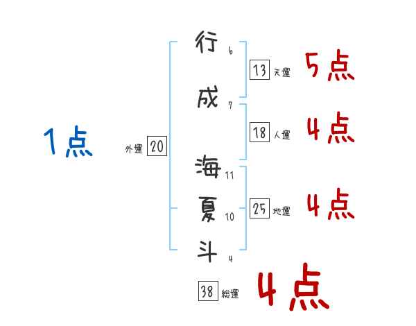 人運![]() | 行成海夏斗さんの人運は18画の4つ星!情熱的で剛気。忍耐力があり信頼される。 性格や才能などを表す2番目に重要な運勢です。人間関係や協調性、社会的な成功に影響します。主に20歳から50歳ぐらいまでの中年期の運勢を表します。 |