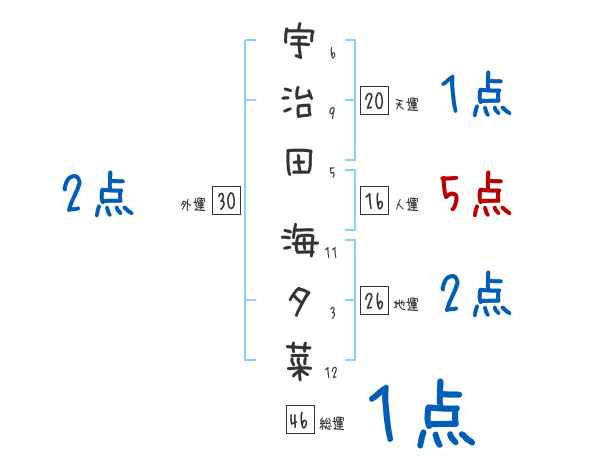 外運![]() | 宇治田海夕菜さんの外運は30画の2つ星!浮き沈みの激しさに注意しましょう。 生活面を象徴する運勢です。外部から受ける影響力を表し、結婚運、家庭運や職場、環境への順応性を表します。 |