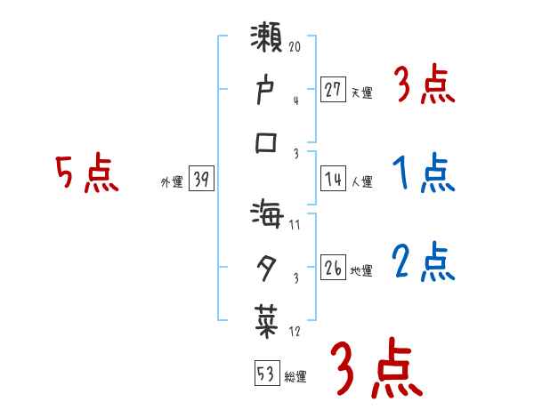 外運![]() | 瀬戸口海夕菜さんの外運は39画の5つ星!社交性に優れ人望が厚い。人の上に立ち成功する。 生活面を象徴する運勢です。外部から受ける影響力を表し、結婚運、家庭運や職場、環境への順応性を表します。 |