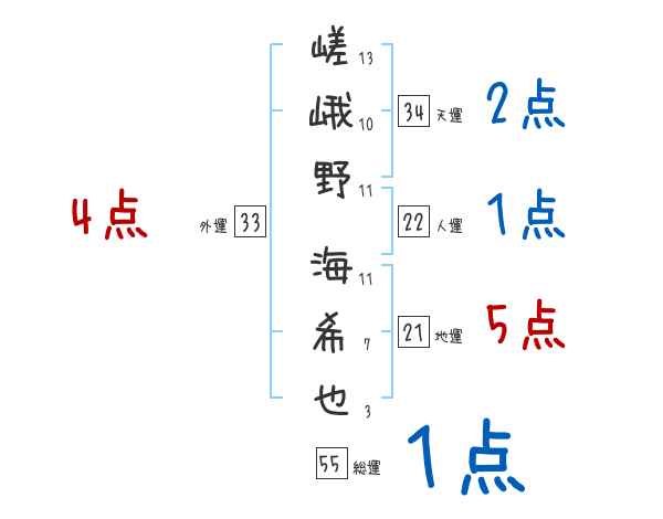 天運![]() | 嵯峨野海希也さんの天運は34画の2つ星!独創性に優れるが、自尊心が強く災難に注意しましょう。 家系が持つ宿命的な運勢を表します。祖先から受け継いだ苗字ですので自分の力が及びません。家柄を象徴します。 |