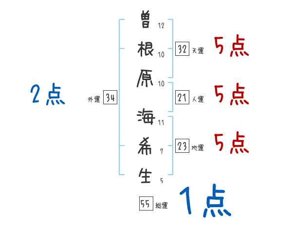 天運![]() | 曽根原海希生さんの天運は32画の5つ星!柔軟性があり成功する。チャンスが多く金運が良い。 家系が持つ宿命的な運勢を表します。祖先から受け継いだ苗字ですので自分の力が及びません。家柄を象徴します。 |
