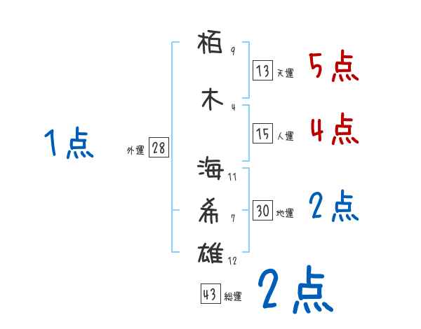 総運![]() | 栢木海希雄さんの総運は43画の2つ星!頑固な性格で独立心が強いかも。やや非現実的で浪費に注意しましょう。 あなたの人生を表す1番重要な運勢です。生涯を通じて影響する総合運となり、主に50歳以降の晩年期に影響を及ぼします。 |
