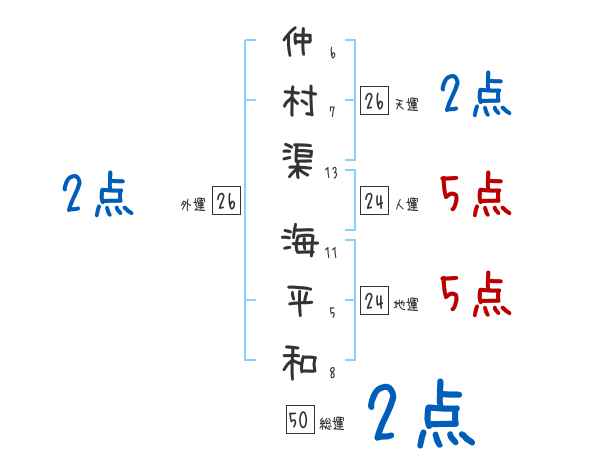 人運![]() | 仲村渠海平和さんの人運は24画の5つ星!家庭運が良く順調な人生。金運にも恵まれる。 性格や才能などを表す2番目に重要な運勢です。人間関係や協調性、社会的な成功に影響します。主に20歳から50歳ぐらいまでの中年期の運勢を表します。 |