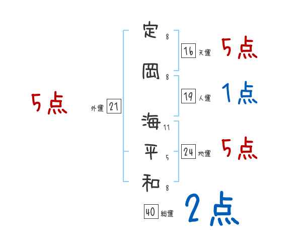 外運![]() | 定岡海平和さんの外運は21画の5つ星!統率力がある。独立し成功する。名誉を手に入れる。 生活面を象徴する運勢です。外部から受ける影響力を表し、結婚運、家庭運や職場、環境への順応性を表します。 |