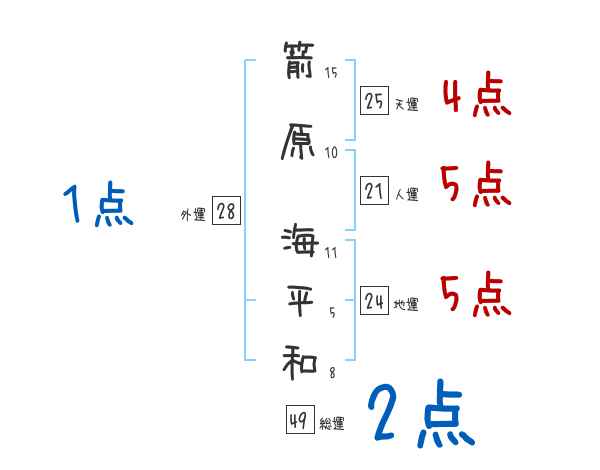 総運![]() | 箭原海平和さんの総運は49画の2つ星!不安定な性格で明暗がある人生。周りの人には支援されやすい。 あなたの人生を表す1番重要な運勢です。生涯を通じて影響する総合運となり、主に50歳以降の晩年期に影響を及ぼします。 |