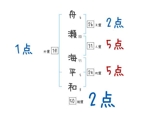 地運![]() | 舟瀬海平和さんの地運は24画の5つ星!家庭運が良く順調な人生。金運にも恵まれる。 個性を表す基礎的な運勢です。性格形成や対人関係、行動力など家庭環境に影響されます。主に誕生してから20歳くらいまでの若年期の運勢を表します。 |