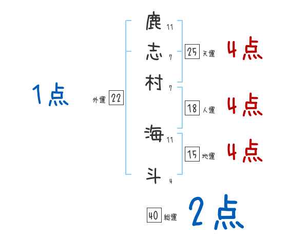 天運![]() | 鹿志村海斗さんの天運は25画の4つ星!個性があり才能があふれる。強運の持ち主で発展する。 家系が持つ宿命的な運勢を表します。祖先から受け継いだ苗字ですので自分の力が及びません。家柄を象徴します。 |