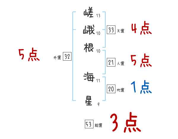 外運![]() | 嵯峨根海星さんの外運は32画の5つ星!柔軟性があり成功する。チャンスが多く金運が良い。 生活面を象徴する運勢です。外部から受ける影響力を表し、結婚運、家庭運や職場、環境への順応性を表します。 |
