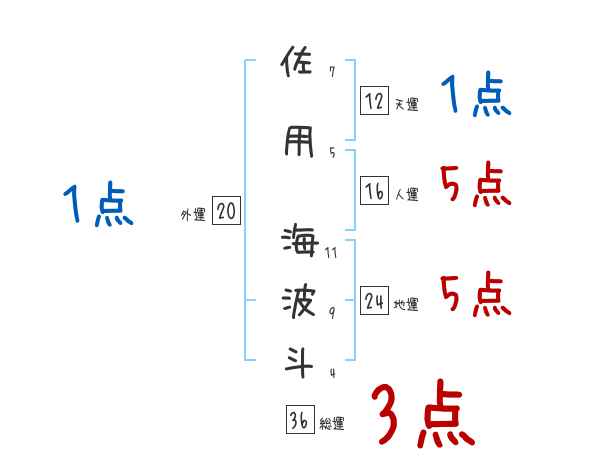 総運![]() | 佐用海波斗さんの総運は36画の3つ星!先見性が豊かです。多少神経質で苦労することも。 あなたの人生を表す1番重要な運勢です。生涯を通じて影響する総合運となり、主に50歳以降の晩年期に影響を及ぼします。 |