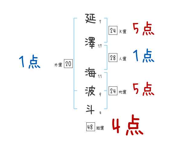 天運![]() | 延澤海波斗さんの天運は24画の5つ星!家庭運が良く順調な人生。金運にも恵まれる。 家系が持つ宿命的な運勢を表します。祖先から受け継いだ苗字ですので自分の力が及びません。家柄を象徴します。 |