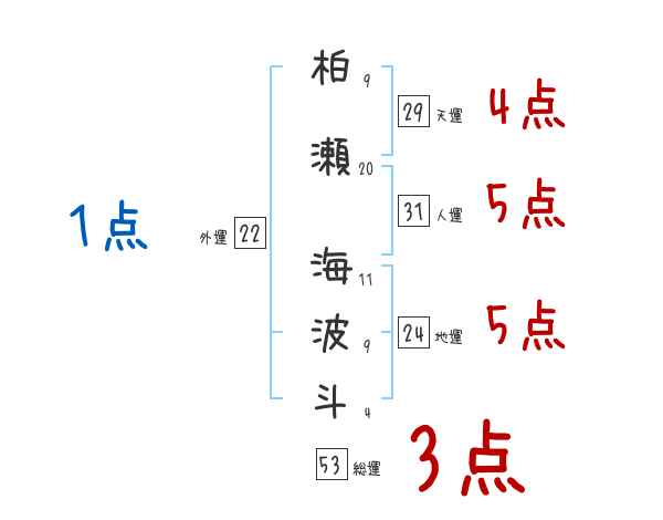 外運![]() | 柏瀬海波斗さんの外運は22画の1つ星!努力することが苦手ないっぽう手先が器用。芸術性にも優れる。 生活面を象徴する運勢です。外部から受ける影響力を表し、結婚運、家庭運や職場、環境への順応性を表します。 |