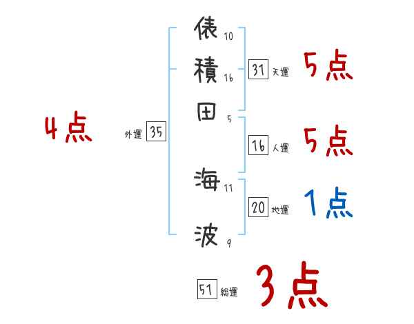 人運![]() | 俵積田海波さんの人運は16画の5つ星!人望が厚く大きく発展する。逆転成功が見える。 性格や才能などを表す2番目に重要な運勢です。人間関係や協調性、社会的な成功に影響します。主に20歳から50歳ぐらいまでの中年期の運勢を表します。 |