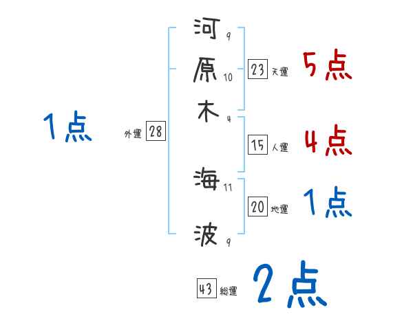 天運![]() | 河原木海波さんの天運は23画の5つ星!想像力に優れ活力がある。一代で成功し名誉を手に入れる。 家系が持つ宿命的な運勢を表します。祖先から受け継いだ苗字ですので自分の力が及びません。家柄を象徴します。 |