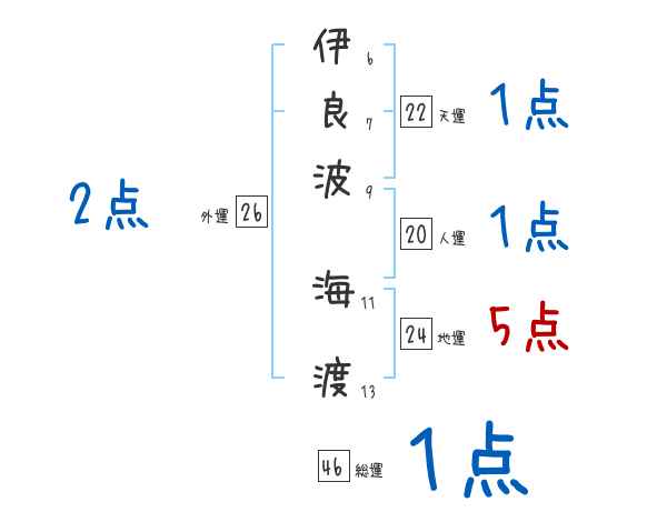 外運![]() | 伊良波海渡さんの外運は26画の2つ星!波瀾万丈かも。信頼できる人を大事にしましょう。 生活面を象徴する運勢です。外部から受ける影響力を表し、結婚運、家庭運や職場、環境への順応性を表します。 |