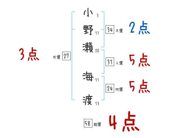 総運![]() | 小野瀬海渡さんの総運は58画の4つ星!安定した生活。大器晩成タイプ。 あなたの人生を表す1番重要な運勢です。生涯を通じて影響する総合運となり、主に50歳以降の晩年期に影響を及ぼします。 |