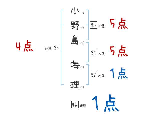 地運![]() | 小野島海理さんの地運は22画の1つ星!努力することが苦手ないっぽう手先が器用。芸術性にも優れる。 個性を表す基礎的な運勢です。性格形成や対人関係、行動力など家庭環境に影響されます。主に誕生してから20歳くらいまでの若年期の運勢を表します。 |