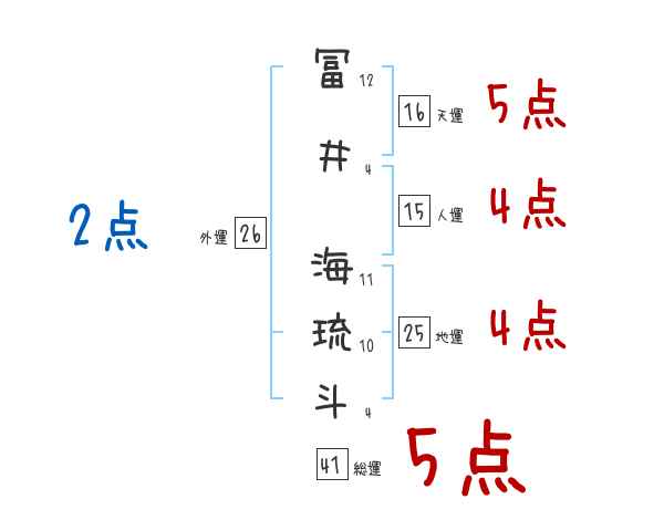 天運![]() | 冨井海琉斗さんの天運は16画の5つ星!人望が厚く大きく発展する。逆転成功が見える。 家系が持つ宿命的な運勢を表します。祖先から受け継いだ苗字ですので自分の力が及びません。家柄を象徴します。 |