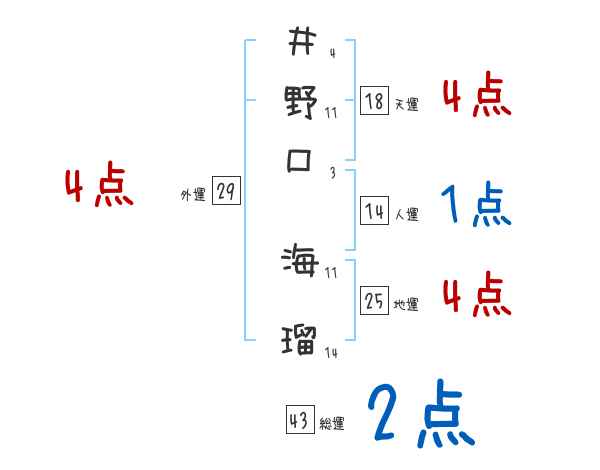 外運![]() | 井野口海瑠さんの外運は29画の4つ星!完全主義で才能がある。厳格な心の持ち主。 生活面を象徴する運勢です。外部から受ける影響力を表し、結婚運、家庭運や職場、環境への順応性を表します。 |