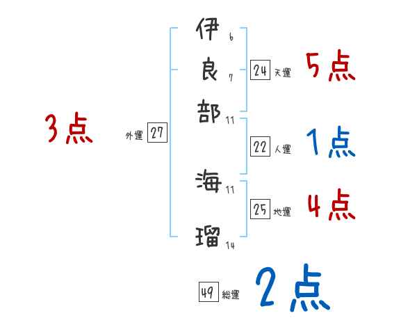 天運![]() | 伊良部海瑠さんの天運は24画の5つ星!家庭運が良く順調な人生。金運にも恵まれる。 家系が持つ宿命的な運勢を表します。祖先から受け継いだ苗字ですので自分の力が及びません。家柄を象徴します。 |