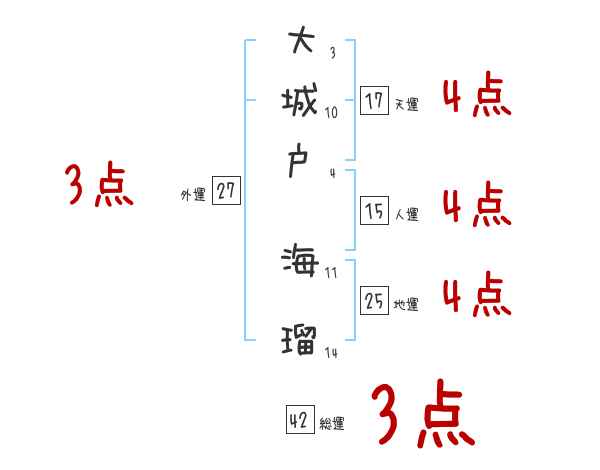 総運![]() | 大城戸海瑠さんの総運は42画の3つ星!病気に注意。多芸であるが消極的でおとなしい。 あなたの人生を表す1番重要な運勢です。生涯を通じて影響する総合運となり、主に50歳以降の晩年期に影響を及ぼします。 |