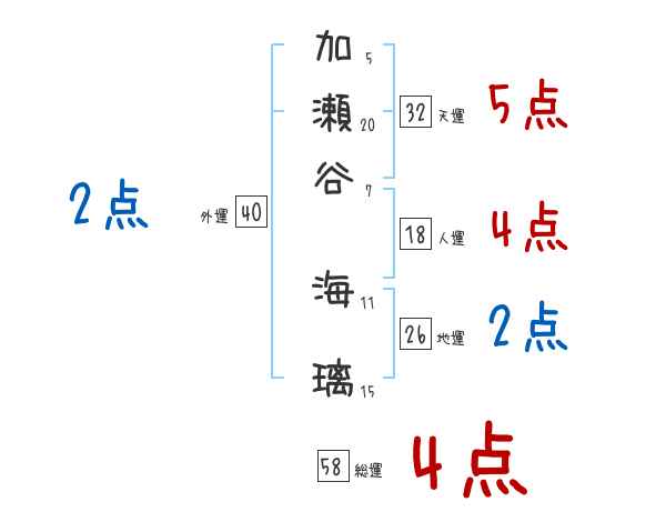 天運![]() | 加瀬谷海璃さんの天運は32画の5つ星!柔軟性があり成功する。チャンスが多く金運が良い。 家系が持つ宿命的な運勢を表します。祖先から受け継いだ苗字ですので自分の力が及びません。家柄を象徴します。 |