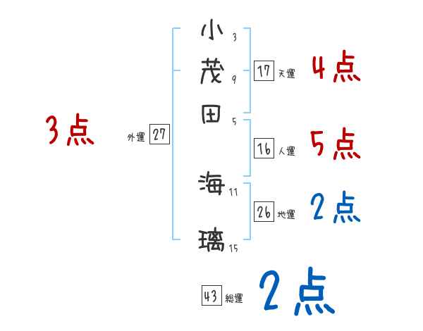 人運![]() | 小茂田海璃さんの人運は16画の5つ星!人望が厚く大きく発展する。逆転成功が見える。 性格や才能などを表す2番目に重要な運勢です。人間関係や協調性、社会的な成功に影響します。主に20歳から50歳ぐらいまでの中年期の運勢を表します。 |