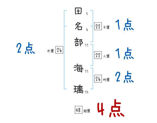 天運![]() | 田名部海璃さんの天運は22画の1つ星!努力することが苦手ないっぽう手先が器用。芸術性にも優れる。 家系が持つ宿命的な運勢を表します。祖先から受け継いだ苗字ですので自分の力が及びません。家柄を象徴します。 |