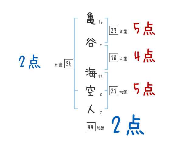 総運![]() | 亀谷海空人さんの総運は44画の2つ星!誠実で慎重な性格。物事を考えすぎないように注意しましょう。 あなたの人生を表す1番重要な運勢です。生涯を通じて影響する総合運となり、主に50歳以降の晩年期に影響を及ぼします。 |