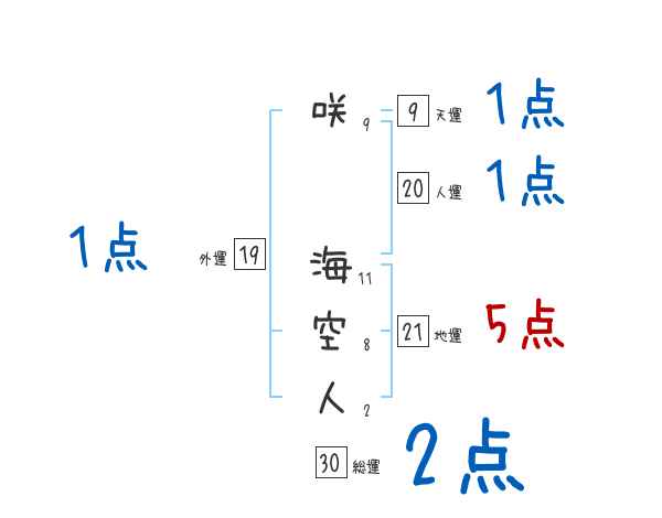 天運![]() | 咲海空人さんの天運は9画の1つ星!消極的で才能を発揮することが苦手なことも。周りの意見に耳を傾けましょう。 家系が持つ宿命的な運勢を表します。祖先から受け継いだ苗字ですので自分の力が及びません。家柄を象徴します。 |