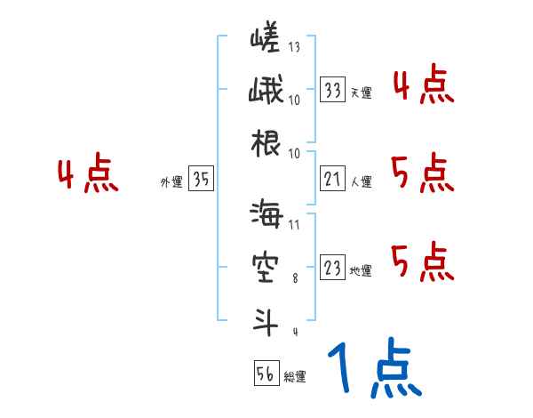 地運![]() | 嵯峨根海空斗さんの地運は23画の5つ星!想像力に優れ活力がある。一代で成功し名誉を手に入れる。 個性を表す基礎的な運勢です。性格形成や対人関係、行動力など家庭環境に影響されます。主に誕生してから20歳くらいまでの若年期の運勢を表します。 |