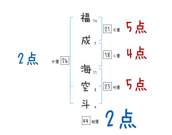 天運![]() | 福成海空斗さんの天運は21画の5つ星!統率力がある。独立し成功する。名誉を手に入れる。 家系が持つ宿命的な運勢を表します。祖先から受け継いだ苗字ですので自分の力が及びません。家柄を象徴します。 |