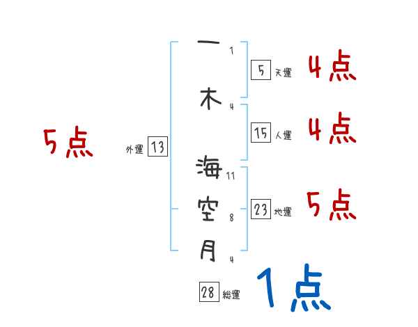 天運![]() | 一木海空月さんの天運は5画の4つ星!健康で安泰。協調性に優れ、財産に恵まれる。 家系が持つ宿命的な運勢を表します。祖先から受け継いだ苗字ですので自分の力が及びません。家柄を象徴します。 |