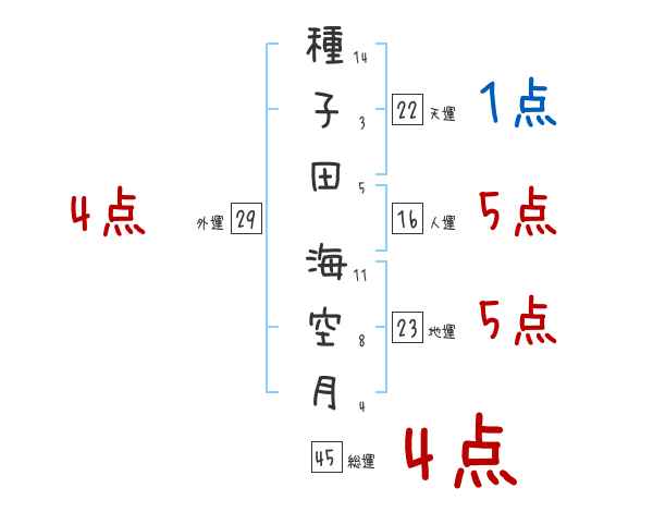 外運![]() | 種子田海空月さんの外運は29画の4つ星!完全主義で才能がある。厳格な心の持ち主。 生活面を象徴する運勢です。外部から受ける影響力を表し、結婚運、家庭運や職場、環境への順応性を表します。 |