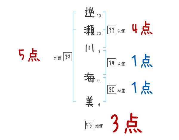 総運![]() | 逆瀬川海美さんの総運は53画の3つ星!やや見栄っ張りで虚栄心がある。散財に注意。 あなたの人生を表す1番重要な運勢です。生涯を通じて影響する総合運となり、主に50歳以降の晩年期に影響を及ぼします。 |