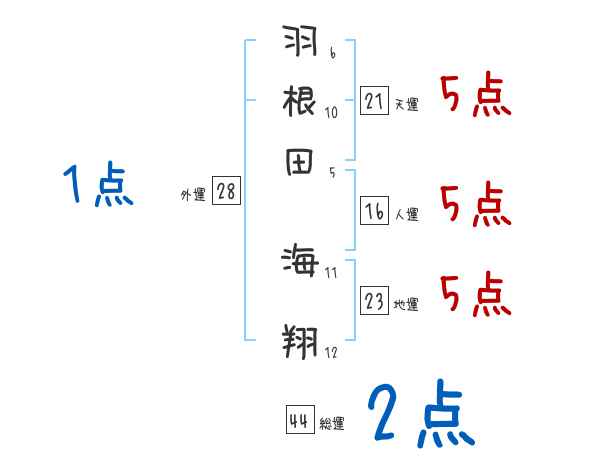 総運![]() | 羽根田海翔さんの総運は44画の2つ星!誠実で慎重な性格。物事を考えすぎないように注意しましょう。 あなたの人生を表す1番重要な運勢です。生涯を通じて影響する総合運となり、主に50歳以降の晩年期に影響を及ぼします。 |