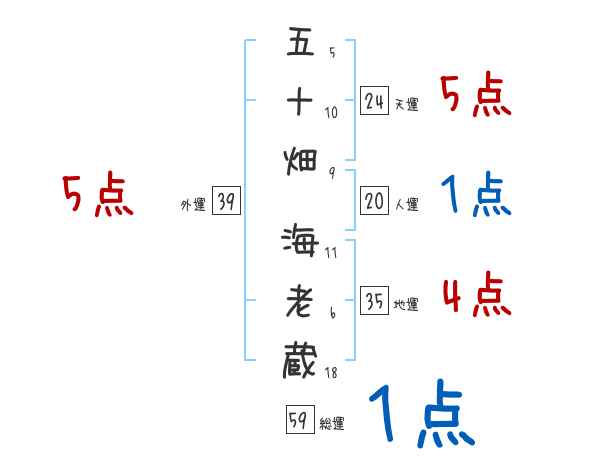 総運![]() | 五十畑海老蔵さんの総運は59画の1つ星!意志の弱さであきらめることが多いかも。粘り強さが必要。 あなたの人生を表す1番重要な運勢です。生涯を通じて影響する総合運となり、主に50歳以降の晩年期に影響を及ぼします。 |