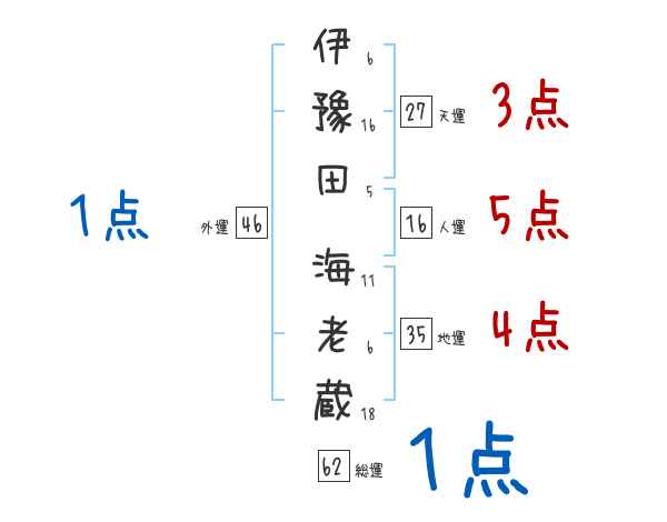 人運![]() | 伊豫田海老蔵さんの人運は16画の5つ星!人望が厚く大きく発展する。逆転成功が見える。 性格や才能などを表す2番目に重要な運勢です。人間関係や協調性、社会的な成功に影響します。主に20歳から50歳ぐらいまでの中年期の運勢を表します。 |