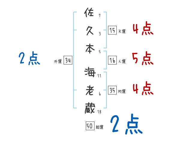 人運![]() | 佐久本海老蔵さんの人運は16画の5つ星!人望が厚く大きく発展する。逆転成功が見える。 性格や才能などを表す2番目に重要な運勢です。人間関係や協調性、社会的な成功に影響します。主に20歳から50歳ぐらいまでの中年期の運勢を表します。 |