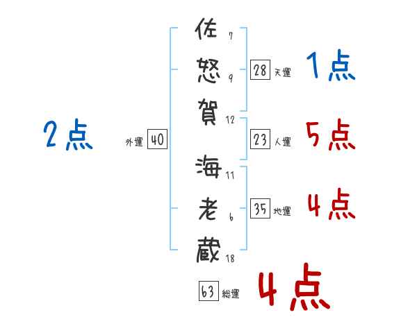 人運![]() | 佐怒賀海老蔵さんの人運は23画の5つ星!想像力に優れ活力がある。一代で成功し名誉を手に入れる。 性格や才能などを表す2番目に重要な運勢です。人間関係や協調性、社会的な成功に影響します。主に20歳から50歳ぐらいまでの中年期の運勢を表します。 |