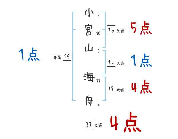 外運![]() | 小宮山海舟さんの外運は19画の1つ星!優れた才能を持ちますが、協調性が足りないことも。周りの人と協力する事を意識しましょう。 生活面を象徴する運勢です。外部から受ける影響力を表し、結婚運、家庭運や職場、環境への順応性を表します。 |